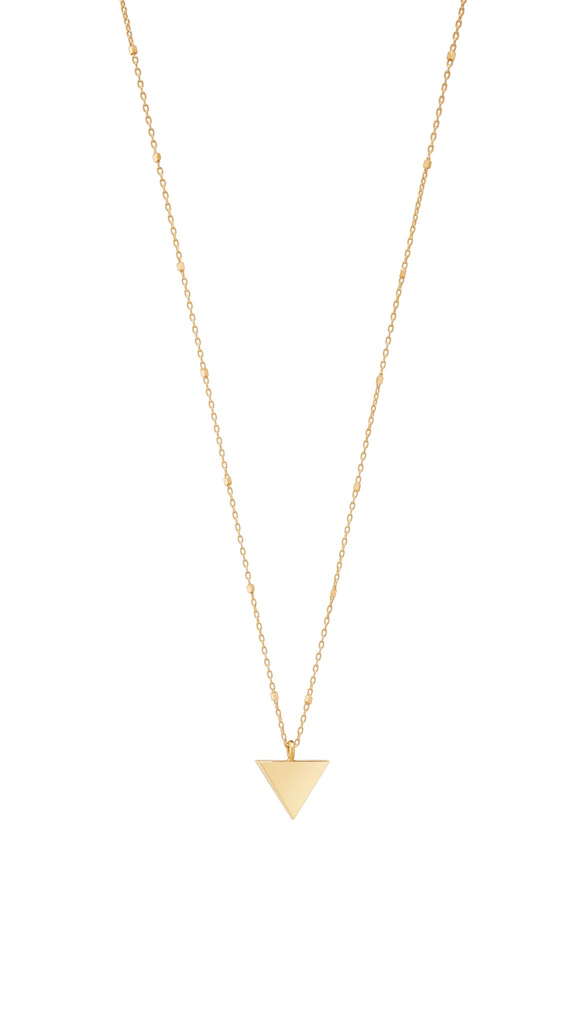 Triangled silver pendant with 0.5mm top layer of 18kt. gold on front on delicate 18kt gold chain with tiny blank squares. The chain is 42 cm.