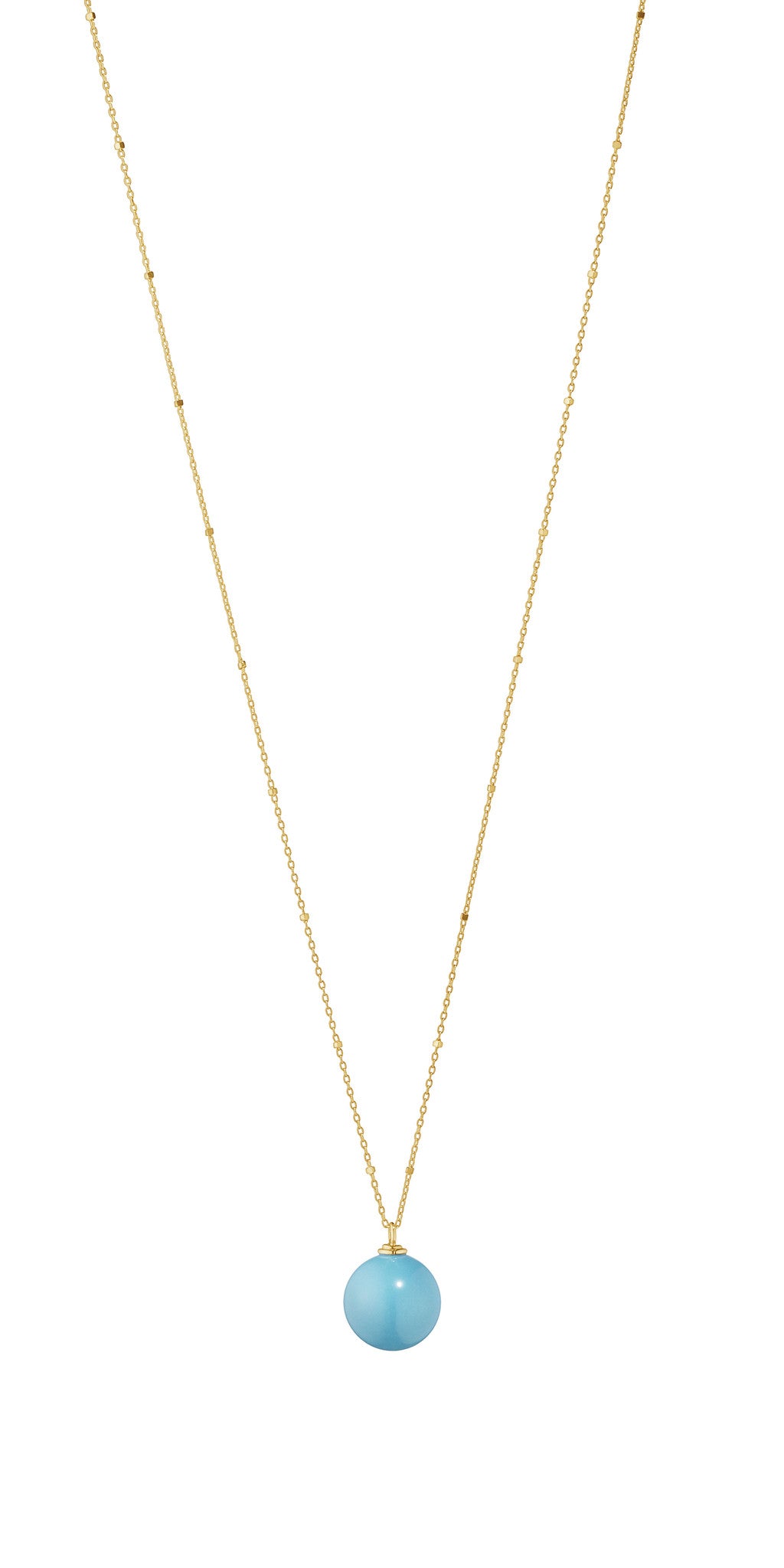 Big bubble turquoise pendant with 18kt gold detail on delicate 18kt. gold chain with tiny blank squares. The chain is 50 cm.
