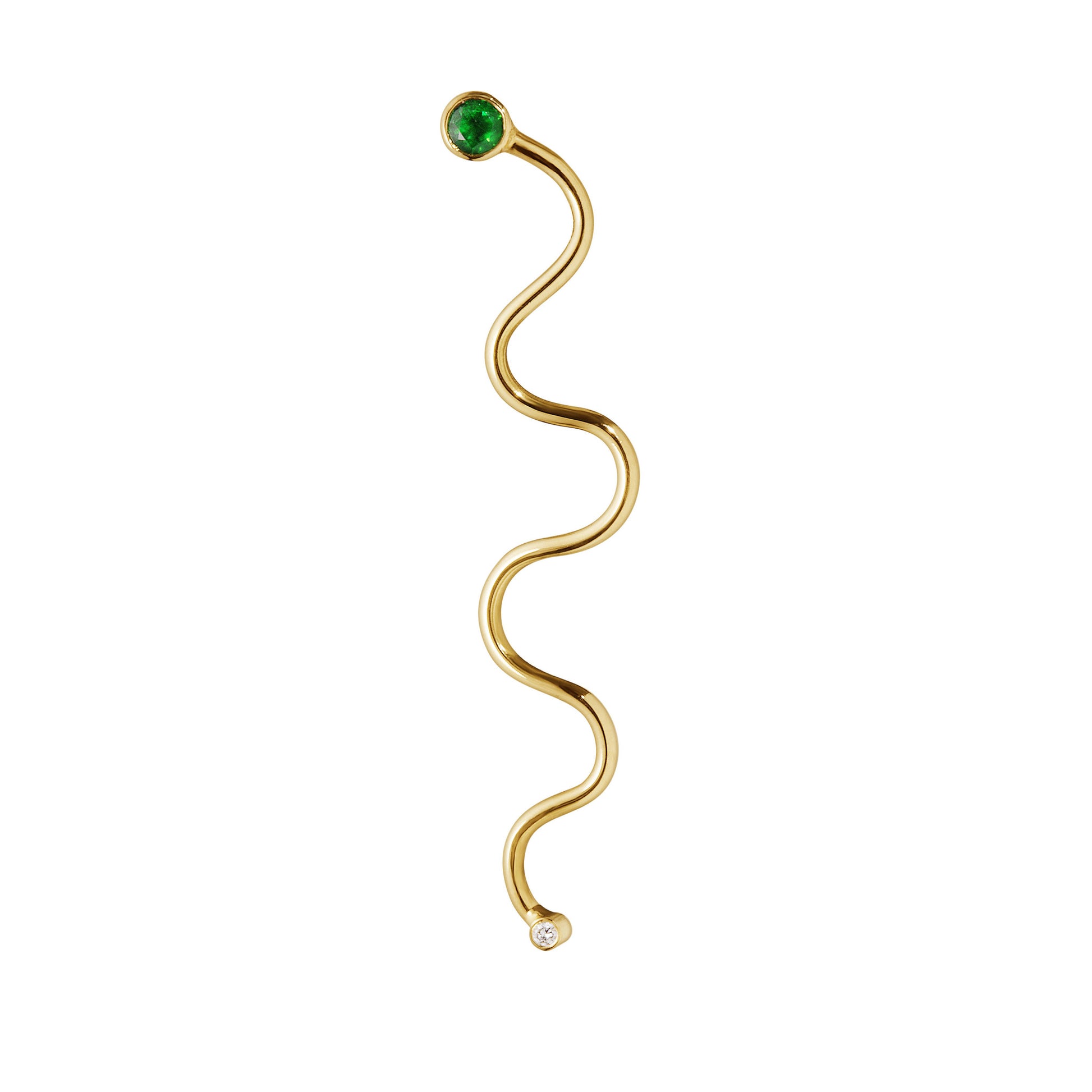 Wavy snake earstud in 18kt. gold with big emerald and 0,005ct. diamond.