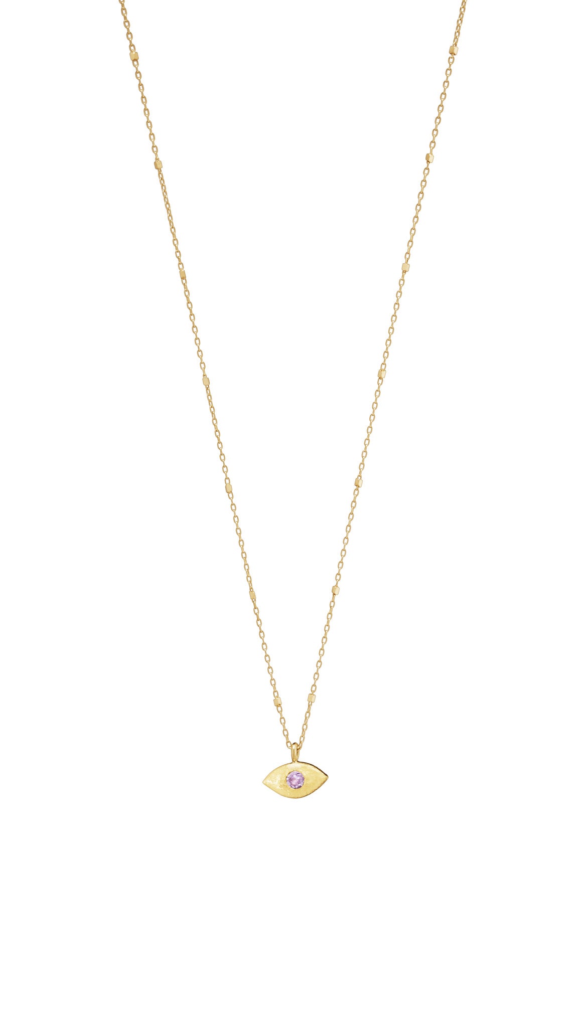 Eye shaped 24kt. gold pendant with pink sapphire on delicate 18kt. gold chain with tiny blank squares. The chain is 42 cm.