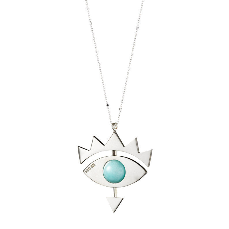 Large eye pendant in silver with moving and turning parts and amazonite. Delicate silver chain with tiny blank squares. The chain is 52 cm.