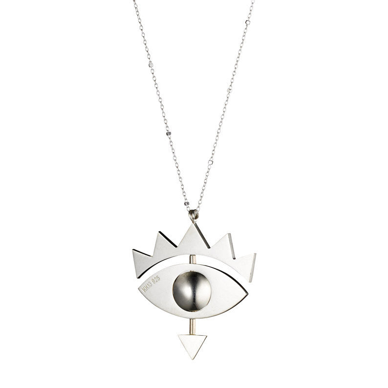 Large eye pendant in silver with moving and turning parts on delicate silver chain with tiny blank squares. The chain is 52 cm.