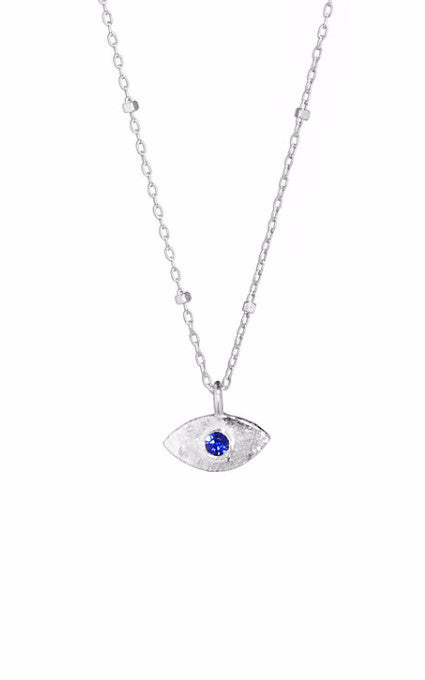 Eye shaped fine silver pendant with big blue sapphire on delicate silver chain with tiny blank squares.