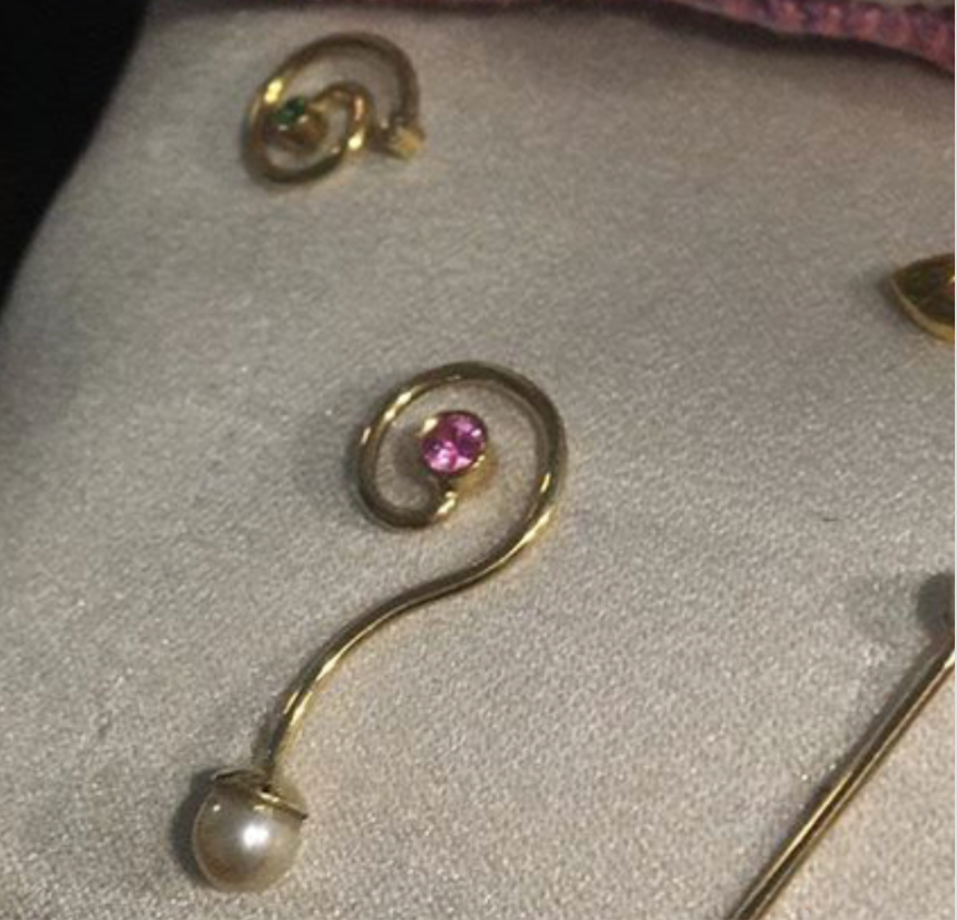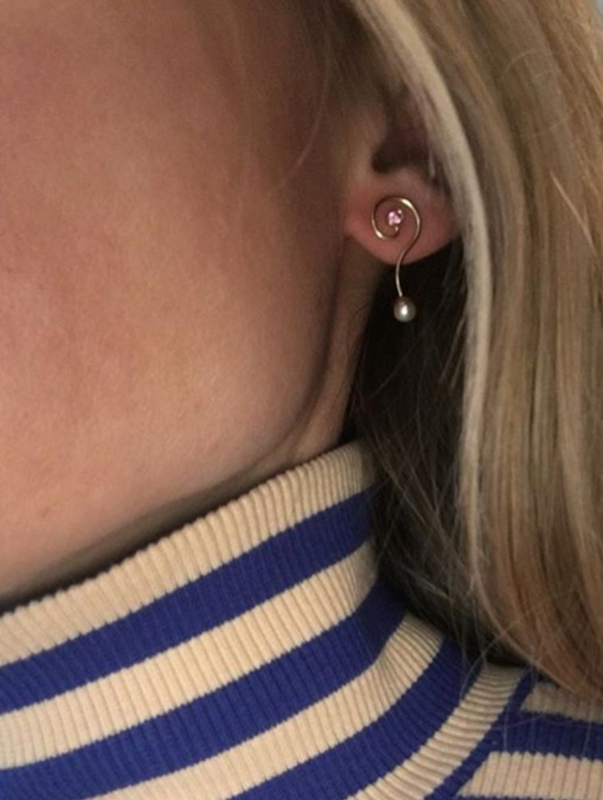This ear stud is made in 18kt. gold with a pink sapphire and a a freshwater pearl.