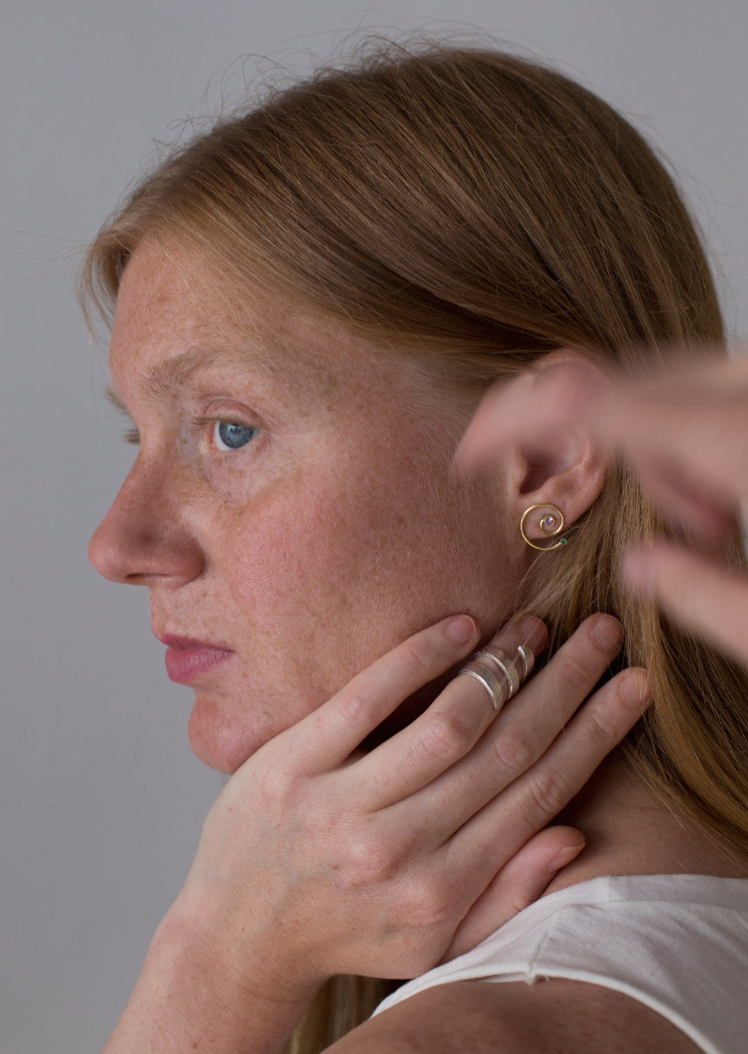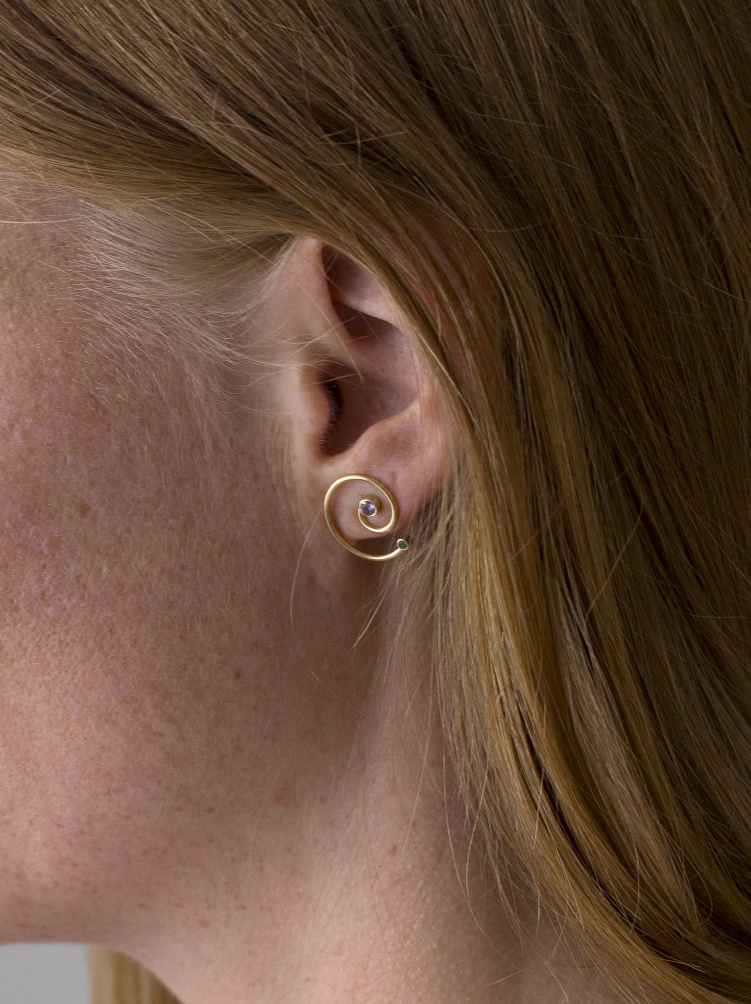 Spiral earstud in 18kt. gold with big pink sapphire and diamond.
