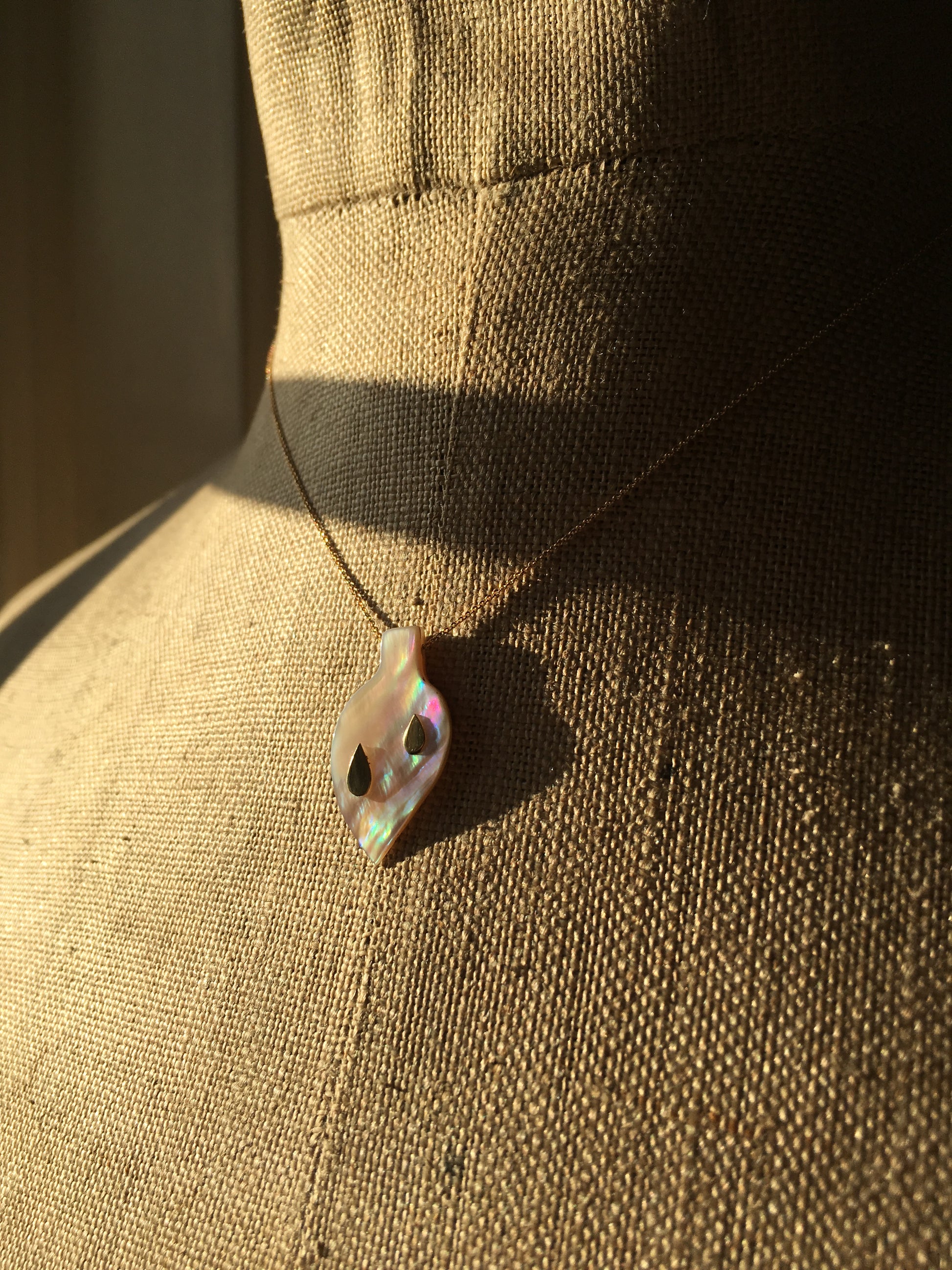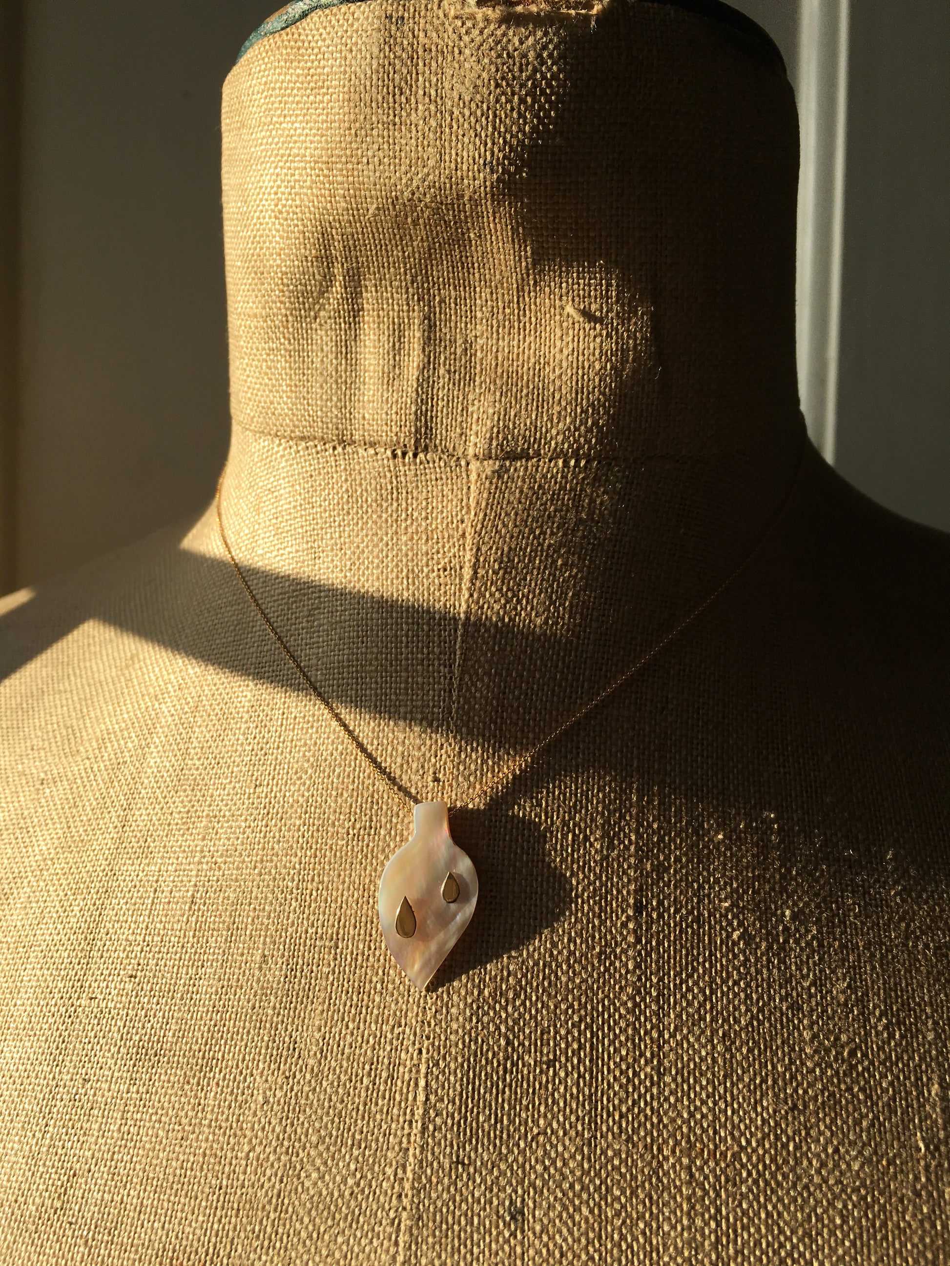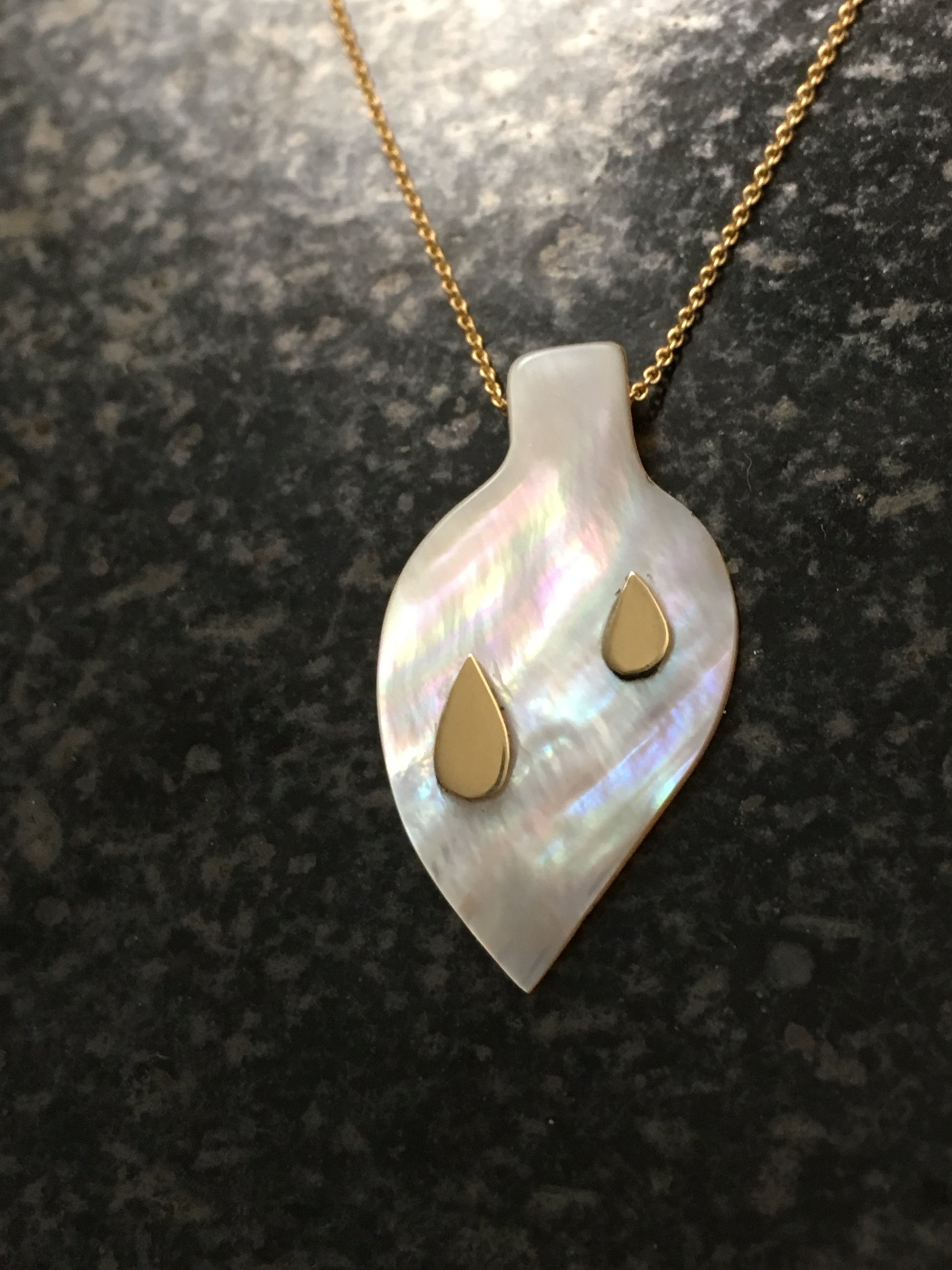 18 kt gold necklace with mother of pearl pendant decorated with two 18 kt gold drops. When catching the light the mother of pearl sihnes in beautiful colors