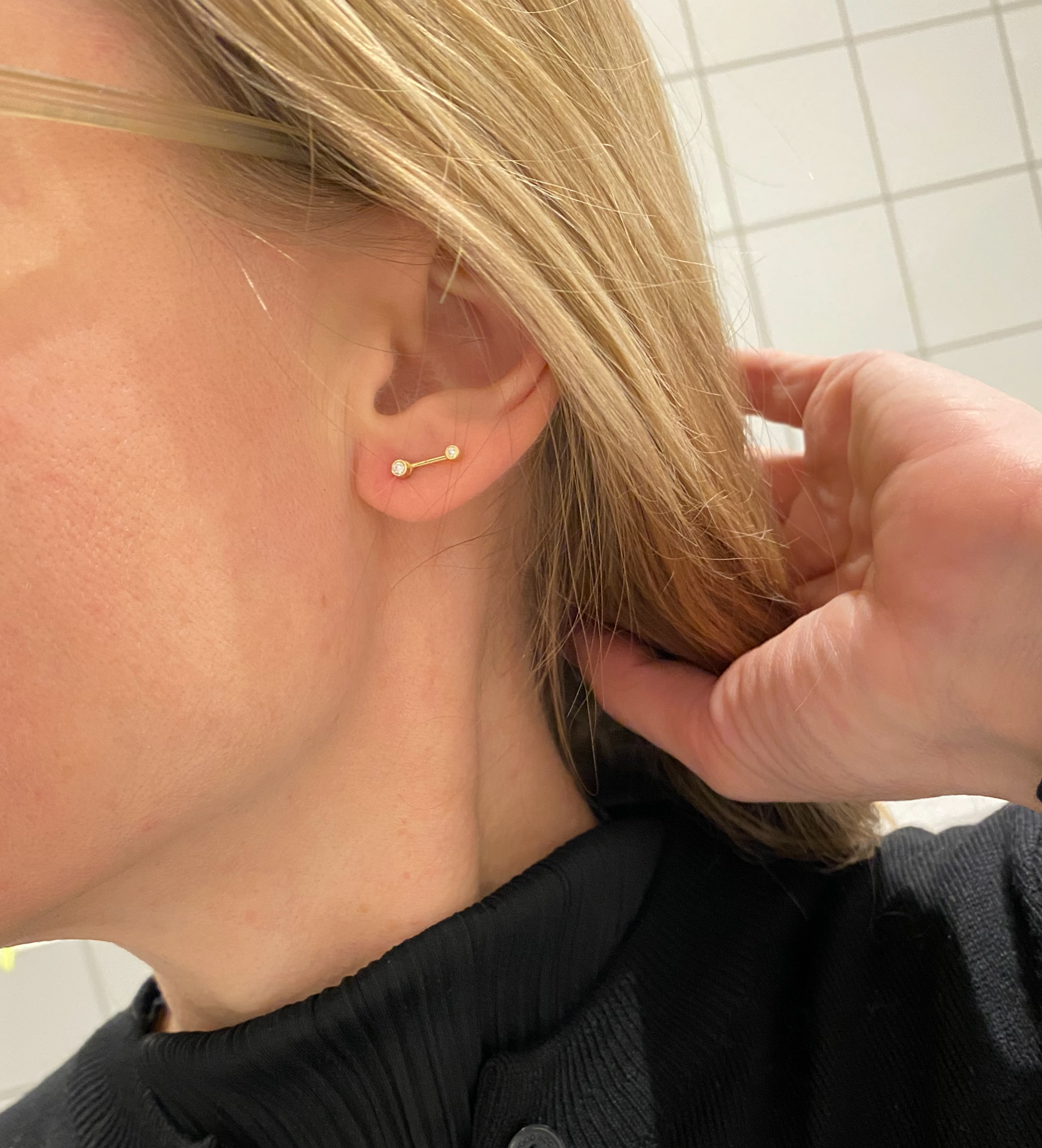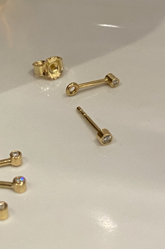 This set consists of an ear stud and a back piece both made in 18 karst gold. The front stud has a 0,02 ct TWVS diamond and the back piece has a 0,015 ct diamond. The set can be worn in two ways as seen on the photos..