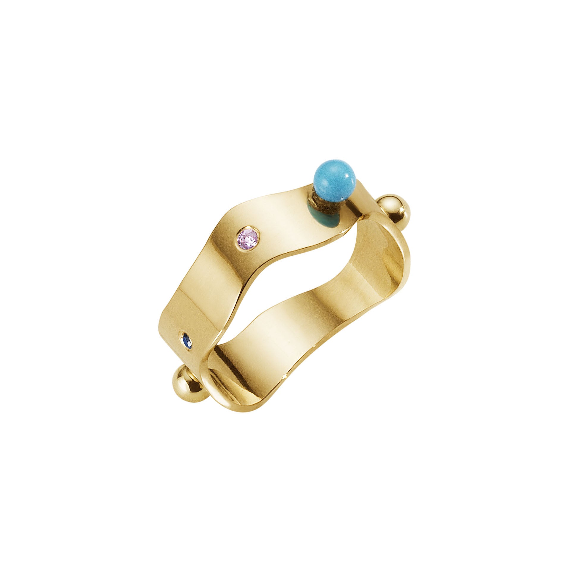 Wavy ring in 18kt. gold with turquoise, pink and blue sapphires and 0,005ct. diamond.