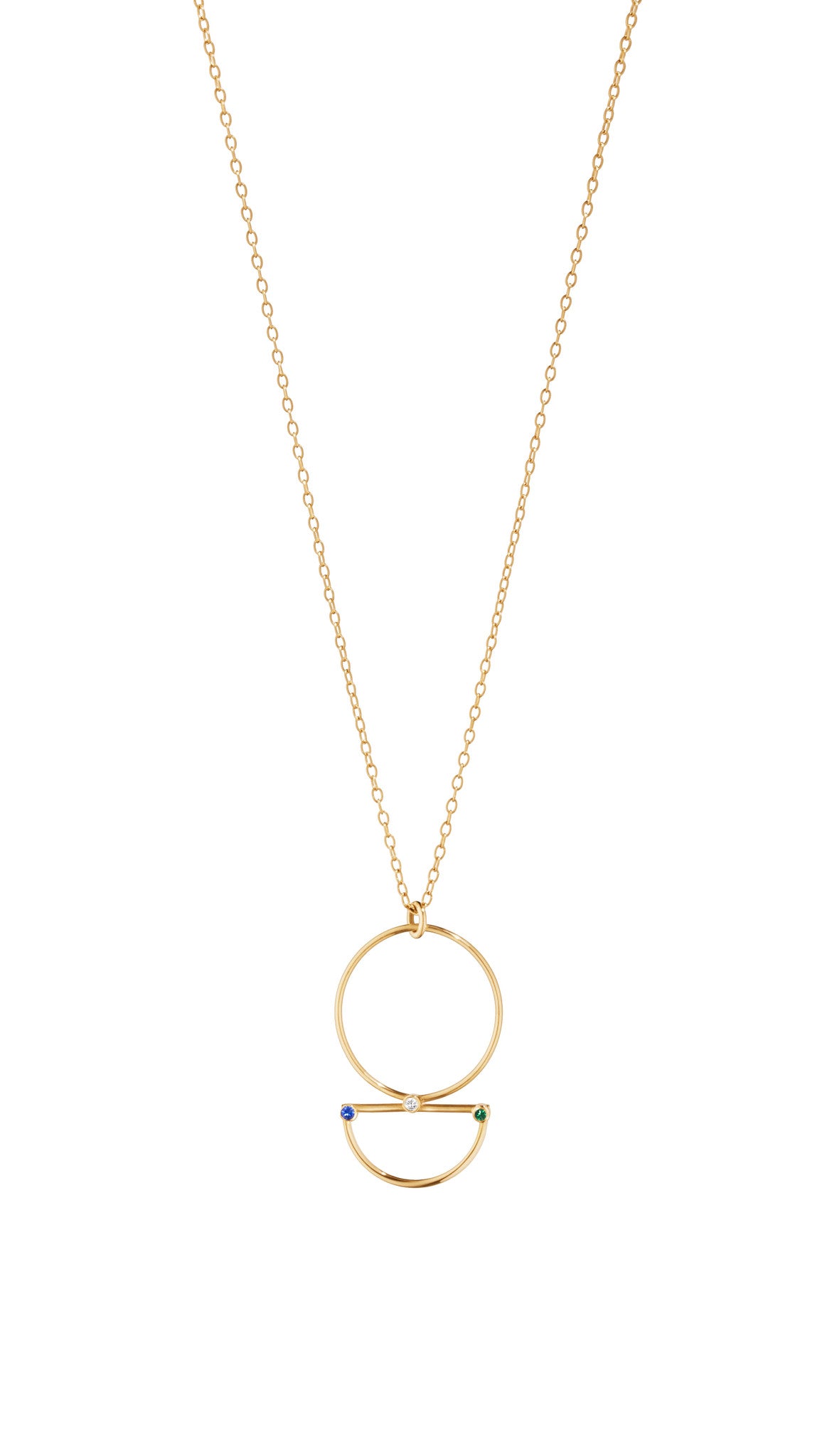 Delicate 18kt. gold pendant with sapphire, emerald and 0,01 carat diamond. 52cm chain in 18kt. gold.