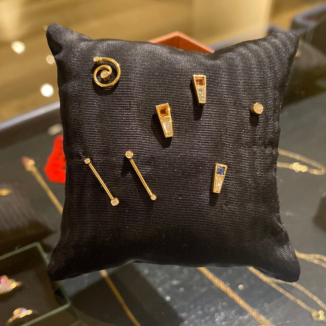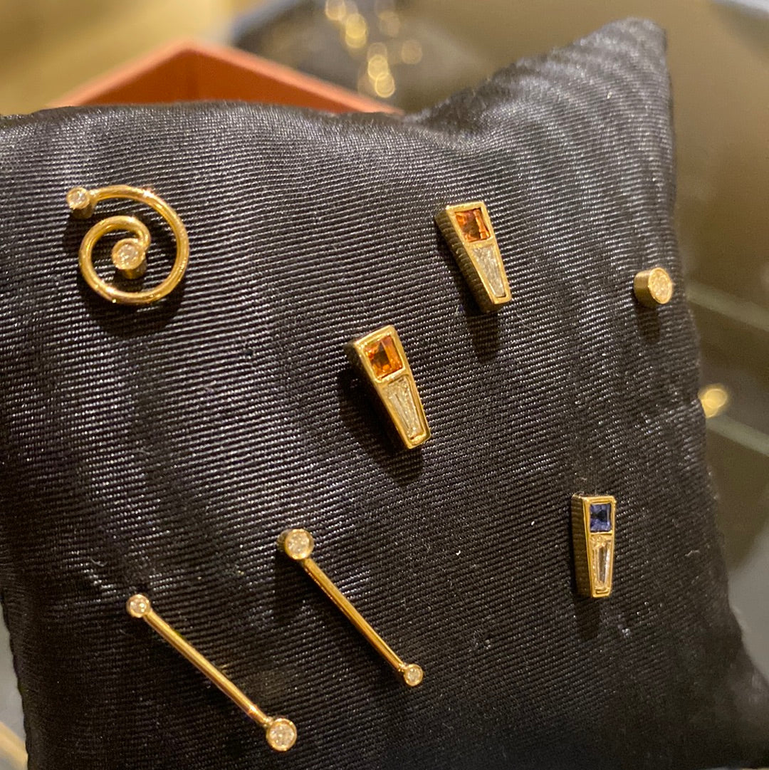 Simple but special ear stud with 0,10 ct trapeze diamond and sapphire set in 18 kt gold. The price is per piece. The stud can be mixed with other types of earrings and also perfect as a pair.