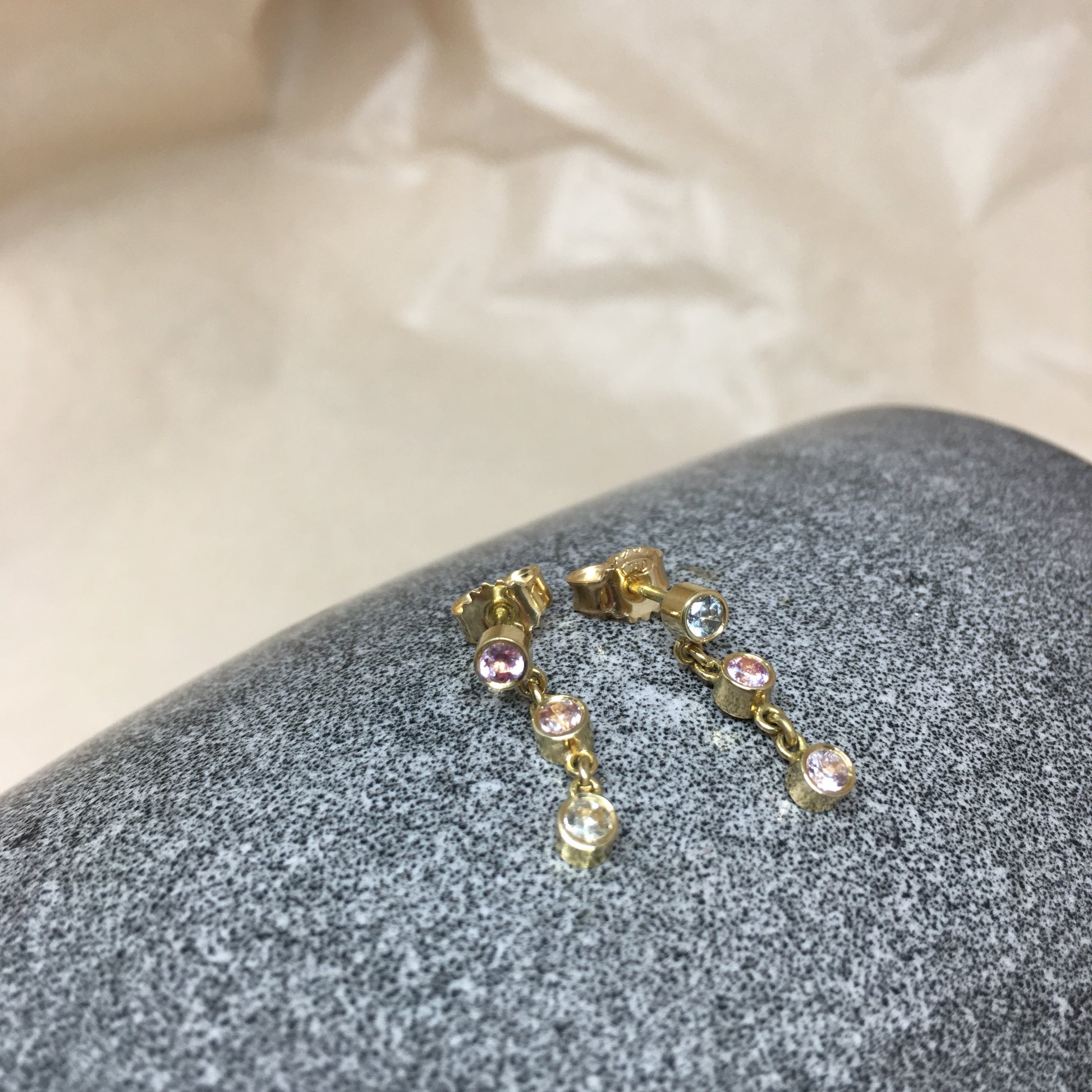 A delicate 18 karat gold earring with three different color sparkeling sapphire. The stones are attached so the move slightly when worn. They can be worn as a set or combined with a different earring in the one ear. The price is per piece.